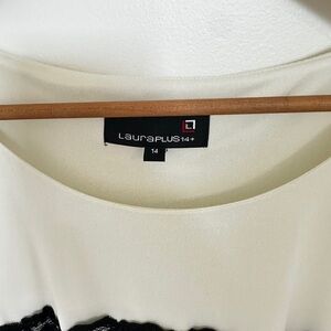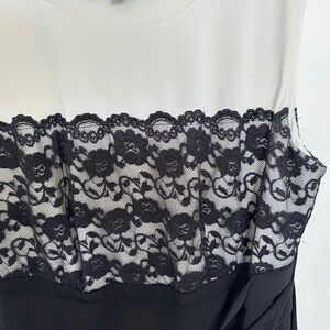 The Laura dress features a sophisticated sheath silhouette with a crisp white bodice and a contrasting black skirt. Its sleeveless design and scoop neckline offer a touch of elegance, while the black lace trim adds a refined accent. Perfect for cocktail occasions, this midi dress embodies timeless style and versatility.