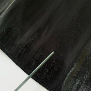 In good condition, this long black panelled skirt is minimalist sleek with a bit of iridescent shine depending on lighting.
