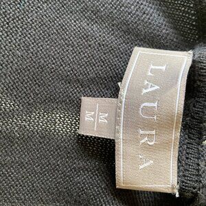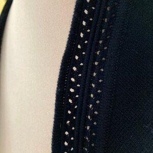 This black open front waterfall sweater vest is trimmed with an open pretty decorative weave. It's 30 inches long and light weight