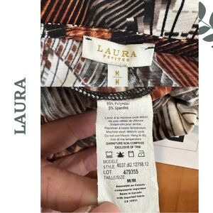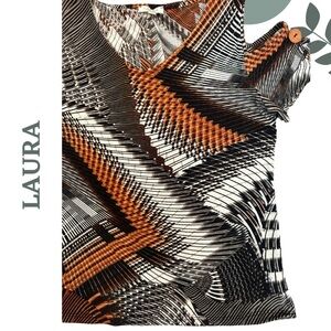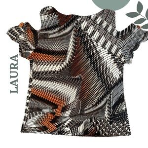 Elevate your wardrobe with the LAura Women's Abstract Print Top. Featuring a striking black, white, and brown design, this top is perfect for any occasion. Enjoy the unique style and comfort from Laura. This top has stretch, a cold shoulder design, making it a perfect top for the warmer months