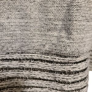 Laura cowl-neck long sweater with grey & black stripes on neckline, cuffs, and hemline. Sleeves can be rolled up to show off the darker interior. Has a little bit of stretch in the knit. 55% Acrylic 45% Cotton. Great used condition.