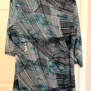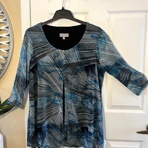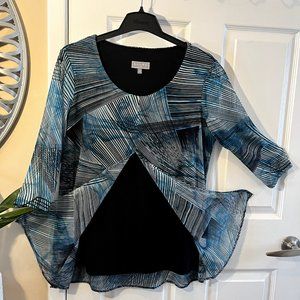 Laura (plus), XL blue tunic top, 2 layered with black underlay. Top layer is split at the front to show the black layer underneath.