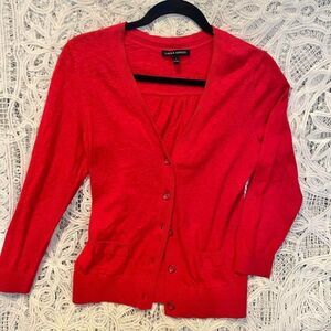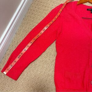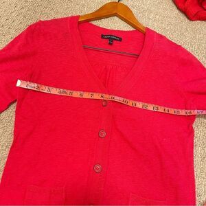This vintage cardigan by Laura Ashley is crafted in a vibrant red-orange hue, adding a pop of color to any outfit. Made from 100% cotton, it features a flattering cut with classic buttons and mini pockets at the bottom, making it both stylish and practical.