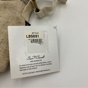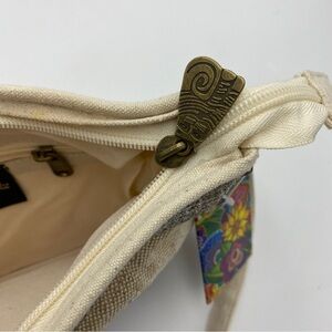 This Laurel Burch Blossoming Felines Crossbody features a bold blue feline on a light background. It measures approx. 11" x 8" x 3"