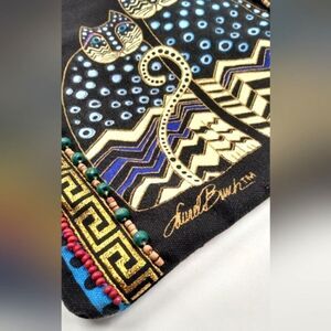 Laurel Burch crossbody purse,bright and vibrant in colour with 2 cats on the front and back of the bag,front pocket with beaded trim,adjustable strap,signed Laurel Burch on the bottom left,tag on the right Laurel Burch,zip tag is a cat in brass signed Laurel Burch.