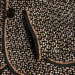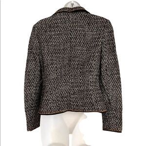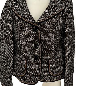 Laurel Blazer, black/gold/white wool blend tweed look, very soft. Two front square pockets, 3 button,trimmed with gold and black fabric around cuffs, lapel and pockets, fully lined