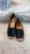 - black calf leather grained texture gold-tone logo plaque contrasting toecap round toe pull-tab at the heel braided raffia sole flat sole