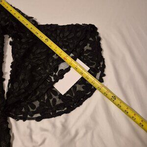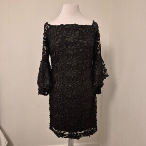 Very beautiful on ... the measurements are in the pictures and there is no tag size available but it is probably a sm/med. Gives that old money coquette style for any occasion. Definitely a feminine evening dress you can play up or down - it's going to look fabulous with high fashion boot or a dress shoe! This dress has a slight stretch and it is lined with a belled high/low sleeve. Love the quality of the fabrics - not to light but a nice weight to keep shape.
