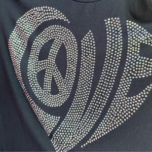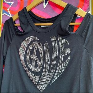 Soft modal top by Lauren Moshi. Crystal embellished “love” graphic on the front. Cutout shoulders. Size small. Made in USA.