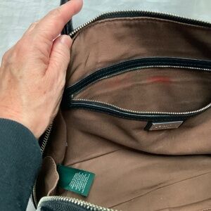 This bag is in excellent condition, inside and out. It has only a minor red mark inside the internal zippered pocket, and it has obviously been badly stored as it was a bit crushed when I got it. I have stuffed it full of towels, and it is regaining its shape quite nicely. You can see by the bottom how it had been stored. There are no marks on the outside leather that I can see, and the silver hardware is still shiny and relatively unmarked—just minor wear on the front snap/badge. This is a gorgeous, structured bag.