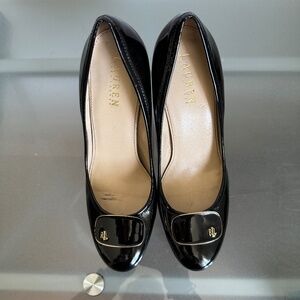 Lauren Ralph Lauren - Black Patent Leather Wedge Gold Trim Logo Pump