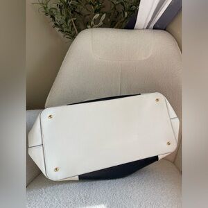 Chic tote with a sleek black center and cream sides. Ideal for everyday elegance.