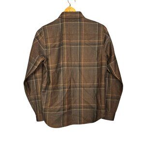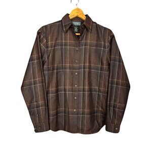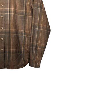 Timeless and polished, this brown plaid button-down shirt is crafted from 100% wool and tailored in a flattering, structured fit. It’s a versatile piece that layers beautifully through the colder seasons and brings a refined touch to casual or workwear looks. The shirt features a soft brushed feel and a full button front with long sleeves. The classic plaid pattern in warm neutral tones makes it easy to style with denim, trousers, or layered under jackets. Tag size is Petite Small.