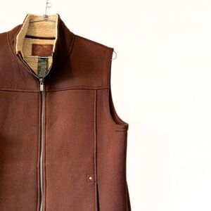 Add a touch of rustic charm to your wardrobe with this Lauren Ralph Lauren Original Dry Goods vest in a rich brown faux suede. Designed with both style and warmth in mind, it features a full zip front, two front snap pockets, and a cozy sherpa-style lining for added comfort. The structured silhouette and high-quality finish make it a great layering piece. Perfect over flannel shirts, sweaters, or lightweight knits—this versatile vest combines classic outdoor appeal with everyday functionality. In excellent condition.