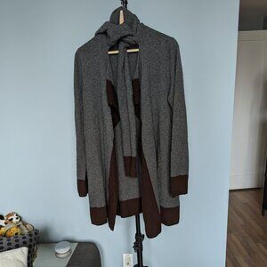 This beautiful open cardigan from Lauren Ralph Lauren is a wool and cashmere blend in tones of grey and brown. Long attached neck ties can be worn open or tied.