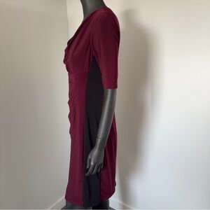 Elegant and flattering, this Lauren Ralph Lauren knee-length dress features a rich burgundy stretch fabric with black side panels for a slimming effect. Designed with a graceful cowl neckline, 3/4 sleeves, and ruching at the waist for a figure-enhancing silhouette. Ideal for weddings, work events, or dinner parties.