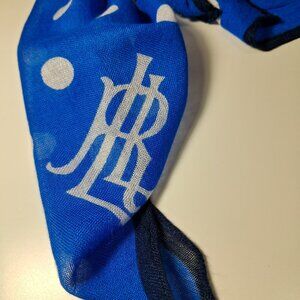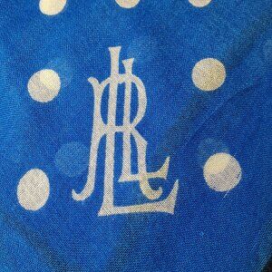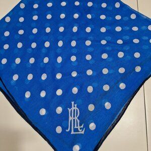 Large square Lauren Ralph Lauren scarf in blue with white polka dots. The letters LRL are printed on the fabric.