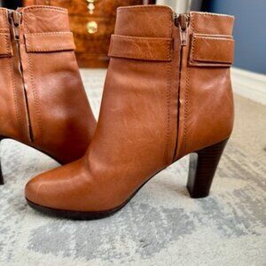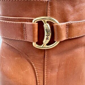 Lauren Ralph Lauren Mandy leather heeled ankle boots in a rich chestnut tan with gold tone logo hardware, size 5. Great used condition, some normal wear as shown in photos. Cat friendly, nonsmoking home.