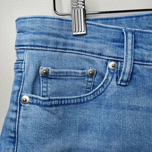 New condition! Faded light denim wash. Cotton/ poly/ elastane blend. Zipper fly. Five pocket style. Distressed cuffs with blue embroidery. Measurements: Inseam 23” Rise 10.5” Lay Flat Waist 16”