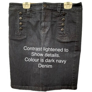 Ralph Lauren Jean midi skirt. Fly and button closure. Back hem slit. Pretty front details with row of buttons down front hips. 2 back pockets ( still sewn closed from manufacturer; I’ll leave you to take stitches out when it reaches your home). Cotton, polyester & Elastane fabric.