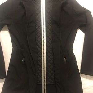 Lauren Ralph Lauren lined jacket with front quilted vest with zipper. Cosy lining in hood, hood has draw strings. There are 2 front pockets with zippers. Small, flattering gatherings at waist and around back giving a fitted feminine look. In exceptional pre-worn condition. Worn only handful of times.