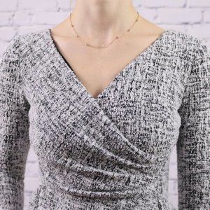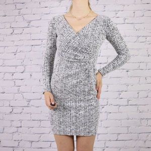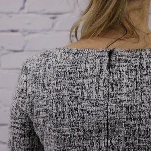 In great, pre-loved condition! There is some washwear but because of the textured nature of tweed, it's very unnoticeable and the dress still looks great! This white and black dress has long sleeves, a v-neck, a bit of ruching at the waist, and a zip closure in the back. For context I am 5'8 (aka NOT petite) and wear size 2, so this dress does not look as great on me as it would on someone who is actually petite.