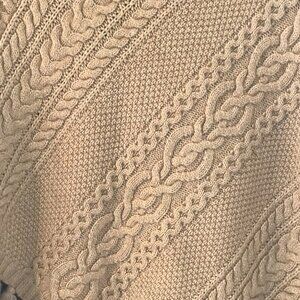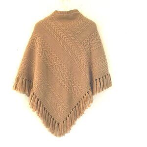 Lauren Ralph Lauren women's poncho in brown/tan one size cable knit with fringes in lambswool blend. Small amount of piling. Bohemian hippie 80's Y2K styling