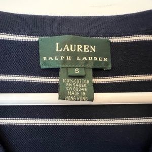 This Ralph Lauren sweater has the classic preppy style that the brand is known for. This striped navy blue and white sweater would be a great addition to a capsule wardrobe. It is a quality piece made of 100% cotton and is in excellent condition with no flaws. It has a white lace closure with gold accents that add style to the piece. It measures 23 inches long and 17 inches from pit to pit. Labelled size small.
