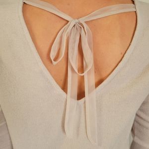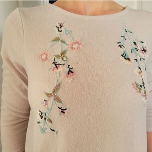 Polyester and spandex. Light beige knit with pink, white, navy, green and tan embroidery.