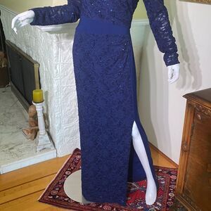 A stunning example of Ralph Lauren‘s classic and timeless designs. This gorgeous floor length gown is made of lace with sequins throughout for a Hollywood wow factor. Demure boat neckline, long sleeves, knee high side slit, and rushing at waist/hip. The dress is lined, slip on style, no zipper.