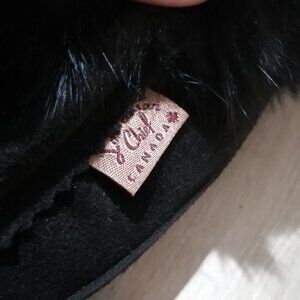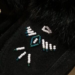 This listing is for a pair of moccasin slippers made in Canada by Laurentian Chief (Eugene Cloutier). These slippers are constructed in black suede leather with black fur trim. They have a padded sole and an orlon lining to keep feet warm and comfy! The toes feature beadwork done in a thunderbird pattern, worked in teal/blue and white glass. These moccasins are BNWT and have never been worn; they come in their original box, but please be aware that the cardboard box is damaged (they were old stock and the box has some tears). They are a Ladies Size 5, which the company's sizing charts note as a 36 in European sizes.