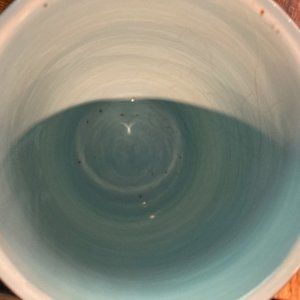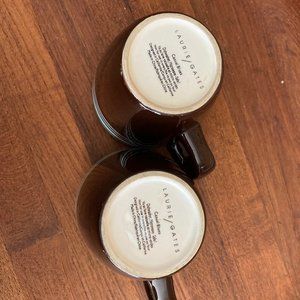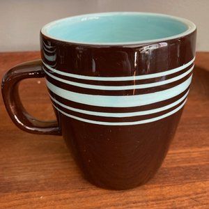 Pair of large brown Laurie Gates mugs with turquoise blue stripes. "Casual Blues" is the style. Each holds 500ml of liquid. No chips or other issues.