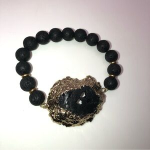 Lava Rock & Druzy Quartz Black Stone Stretch Bracelet Gold Tone OS