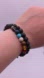 Stylish adjustable and stretch bracelet with multicolor beads. Features black lava stones, blue, white, brown, yellow, and red gemstone and glass beads.