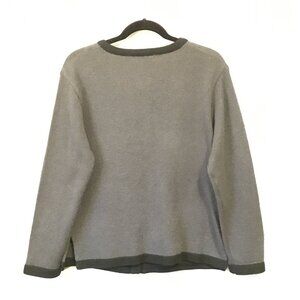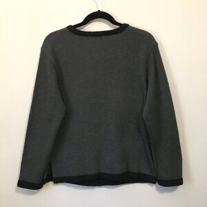 Very good preowned vintage condition, nubby grey, button down sweater cardigan with black buttons and black down the front. Accented by an elegant grey embroidered applique, and sporting two black pockets at either hip, this cardigan is absolutely adorable and unique. A true statement piece.