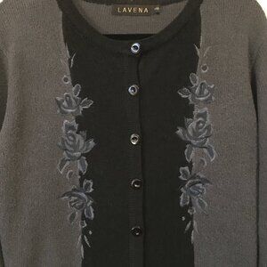 Lavena Black and Grey Embroidered Nubby Button Down Dark Cottage Cardigan