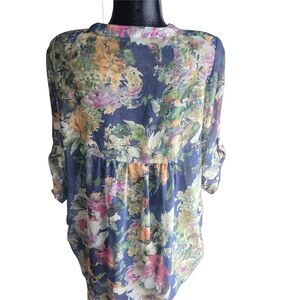Embrace elegance with this floral button neckline top. The vibrant mix of colors adds a touch of sophistication to any outfit. Semi-sheer with cropped sleeves.