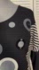 Lavena mixed fabric knit tunic top. Rounded neckline. Striped print used on sleeves, pocket trim and hem casing. Various circle details with metallic applique , beads and large jewels. Single front pocket with edge trim detail and bow. Bottom drawstring. Dropped shoulder design.