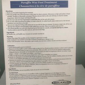 Paraffin wax socks made by Spa Relaxux, lavender scent, can be used for 4 foot treatments.