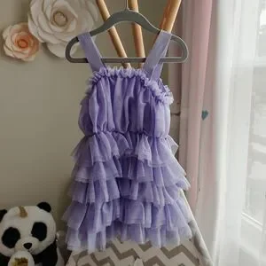 Charming lavender kids dress with playful ruffles, perfect for special occasions.