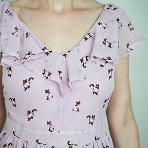 All the Aristocats vibes! You'll be the cat's meow in this cute little number with its kitten print and ruffle collar. I'm reluctantly letting this dress go as I don't reach for it :( Please note that the zipper is a bit tricky to pull up around the waist. Sold out on the website.