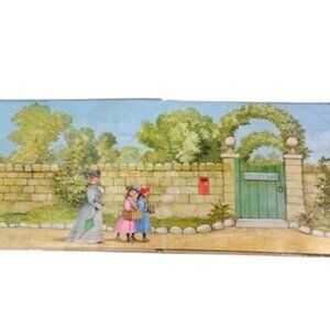 The book begins with a woman and two girls approaching the cottage gate, which opens to reveal a cat sitting on the path. On the next page, they approach a charming thatched cottage. Step through the door to meet Lavinia. The last scene is a pop-up of the entire cottage with Lavinia looking through a window.