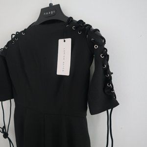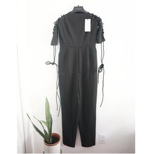 Chic black jumpsuit with lace-up sleeves. Off-shoulder design. Perfect for a night out.