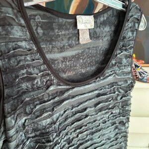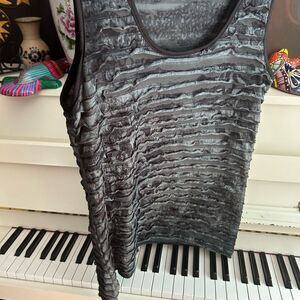 Chic black tank top with textured stripes. Sleeveless design. Ideal for layering or wearing alone.