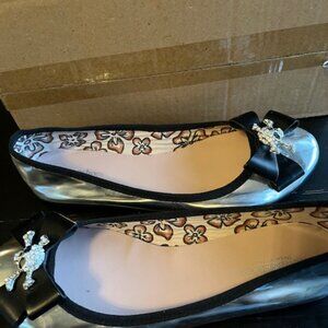 Sold by Town Shoes. Women’s size 11. Color: metallic silver with black bows. Material: outer metallic silver leather, black leather bows and metal skulls embossed with cubic zirconia crystals. Leather insole and fabric lining. Great for Halloween party 2025. NWT.