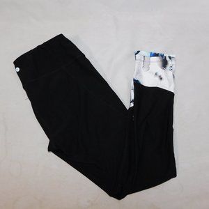 This pair of womens Small Layer8 Qwick-Dry Crop Watercolor Detail Workout Activewear leggings are in great clean condition. Leggings are 88% Polyester - 12% Spandex - Machine washable. Features watercolor design in white blue and gray on bottom of legs and on inside waist band.