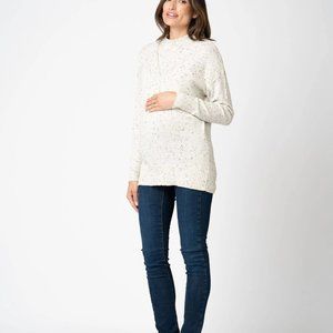Get the layered look without overheating in our Cotton Blend Maternity & Nursing Sweater. Beautifully knit in soft flecked yarn, this style stretches to accommodate your growing bump, ensuring a flattering fit through pregnancy & postpartum. The unique style features a cozy roll neckline layered underneath a classic V neck to create the illusion of layered knits. And this is not just a fashion feature – it’s functional too! After baby is born, the v neckline pulls aside for easy nursing/pumping access, so you can keep wearing it long after your due date.