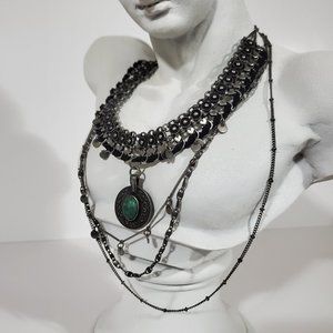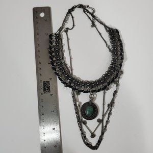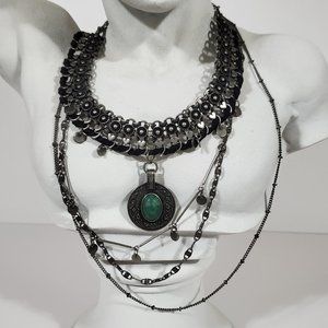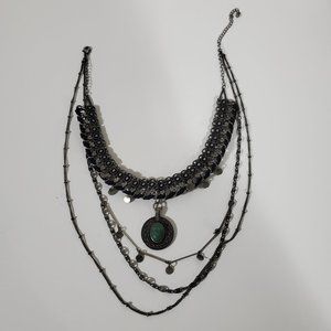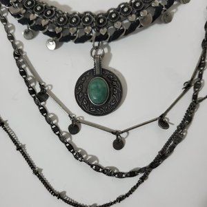 Layered antique looking silver necklace, with impression jade stone and black suede detailing. On the chunky choker side.