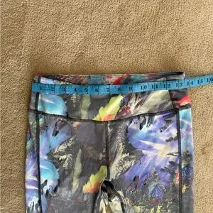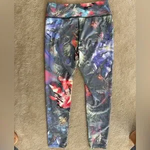 Vibrant abstract print leggings. High-rise waistband. Stretchy performance fabric. Bold red, blue, purple and black accents. Sz S