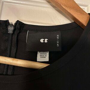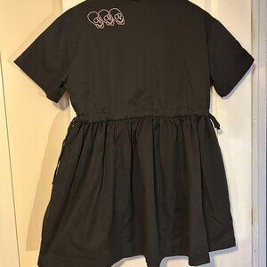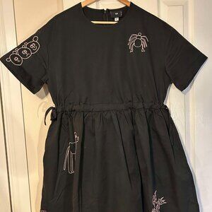 Chic black mini dress. Features playful graphic accents. Casual and trendy style.